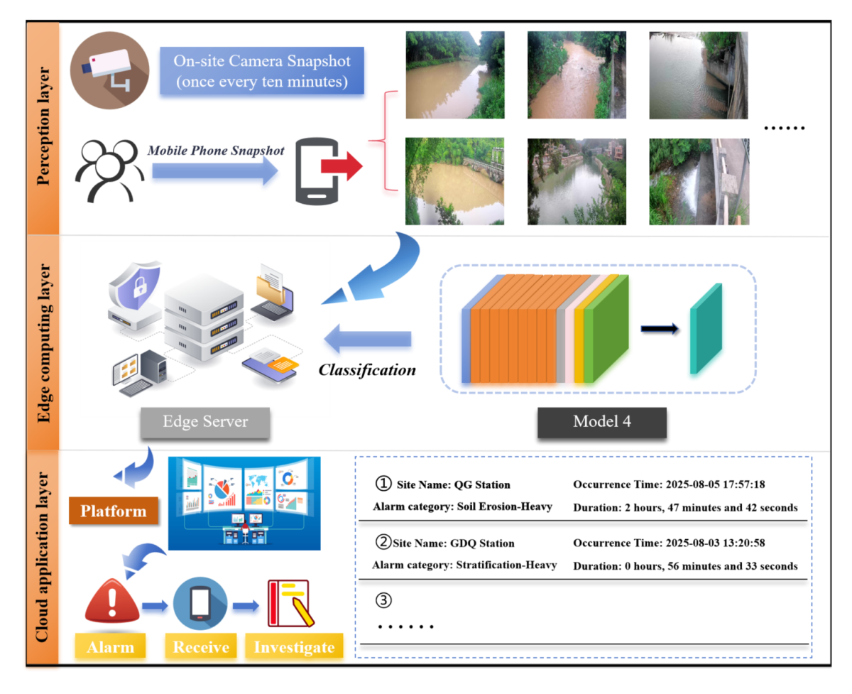 系统采用“感知-边缘-云”三层部署流水线:感知层部署多角度智能相机,边缘计算层实时分析图像并分类为6类黄泥水状态,云应用层生成结构化预警并闭环验证,实现“数据采集-实时分析-预警干预”的智能化闭环。